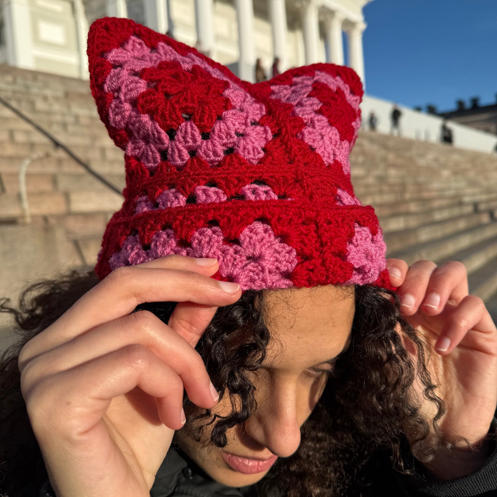 Tämä kissapipo on täydellinen valinta kaikille, jotka rakastavat streetwear-henkistä talvitunnelmaa. Pipo on käsin virkattu korkealaatuisesta langasta ja koottu kauniista isoäidinneliöistä, jotka tuovat siihen ainutlaatuisen ja trendikkään ilmeen. Malli istuu mukavasti päähän ja joustaa sopivasti, joten se sopii monen kokoiselle käyttäjälle. Kevyt ja hengittävä – täydellinen sekä arkikäyttöön että lahjaksi.